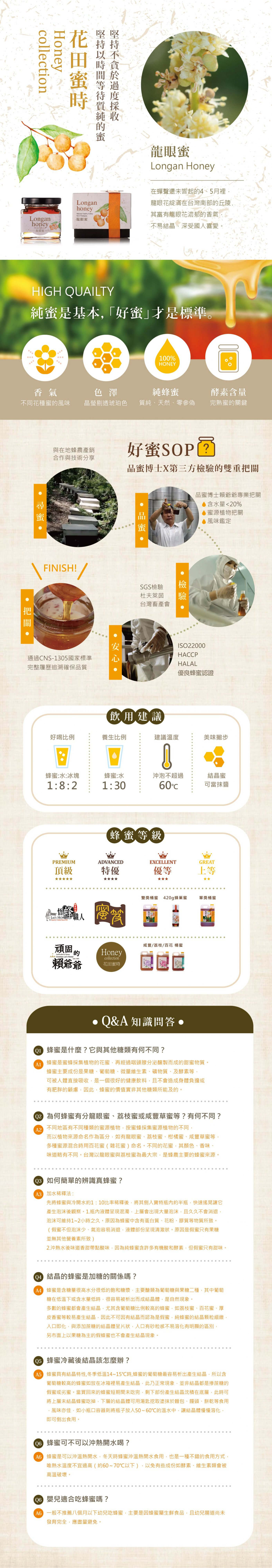 ●品名:花田蜜時 - 龍眼蜜●容量:130g/瓶●成分:蜂蜜(台灣)●原產地:台灣●保存期限:二年