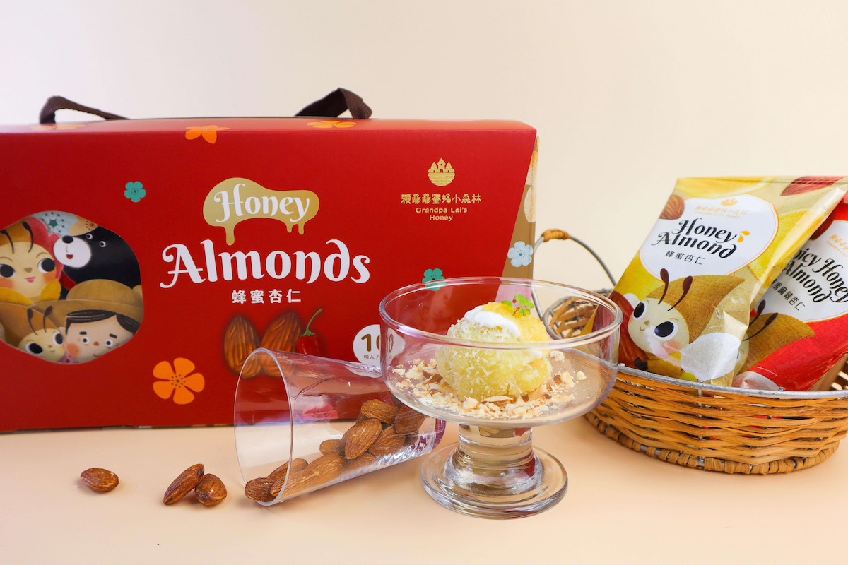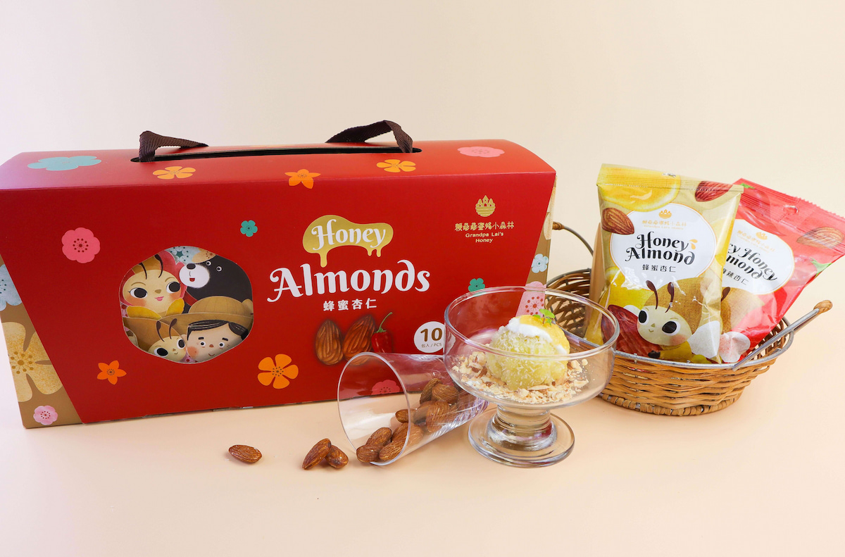 ●品名:蜂蜜杏仁●容量:40 公克/包●成分:杏仁、蜂蜜、糖、蜂蜜粉(龍眼花蜜、麥芽糊精、阿拉伯膠)