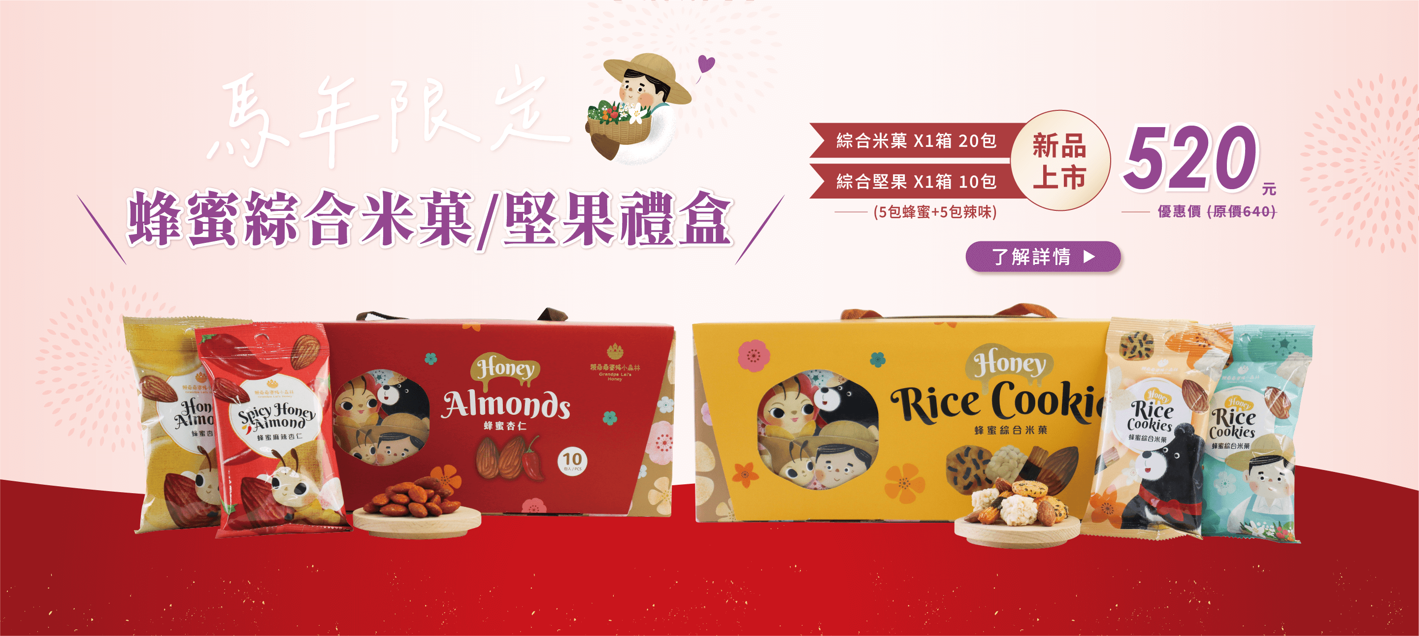●品名:蜂蜜綜合米菓●容量:30公克/包●成分:米、杏仁、糖、蜂蜜、麥芽糖漿、棕櫚油、醬油、樹薯澱粉、麥芽糊精、海苔、蜂蜜粉(龍眼花蜜、麥芽糊精、阿拉伯膠)、乳糖粉、氧化澱粉、鹽、葡萄糖、焦糖色素、辣椒萃取物、醬油粉(黃豆、小麥、鹽、麥芽糊精)、酵母萃取物、甜味劑(蔗糖素)