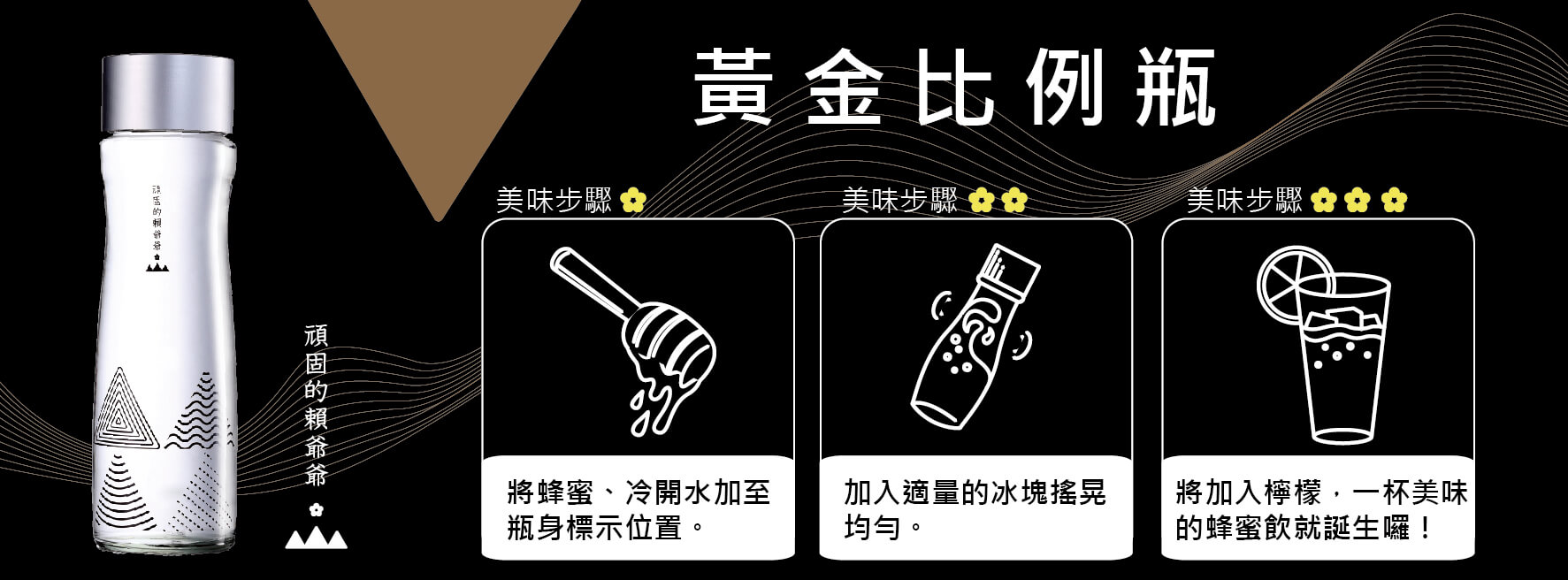 杯體:玻瓶材質 Step1:決定你今天要濃郁or清淡口味。 Step2:第一朵小花,把蜂蜜倒到該位置。 Step3:第二朵小花,把水加到該地方。 Step4:第三朵小花,冰塊放到該處。 Step5:使用萬能雙手,搖搖搖搖搖,你將收穫一杯連蜜蜂都流口水的純天然/無添加的蜂蜜水!!!