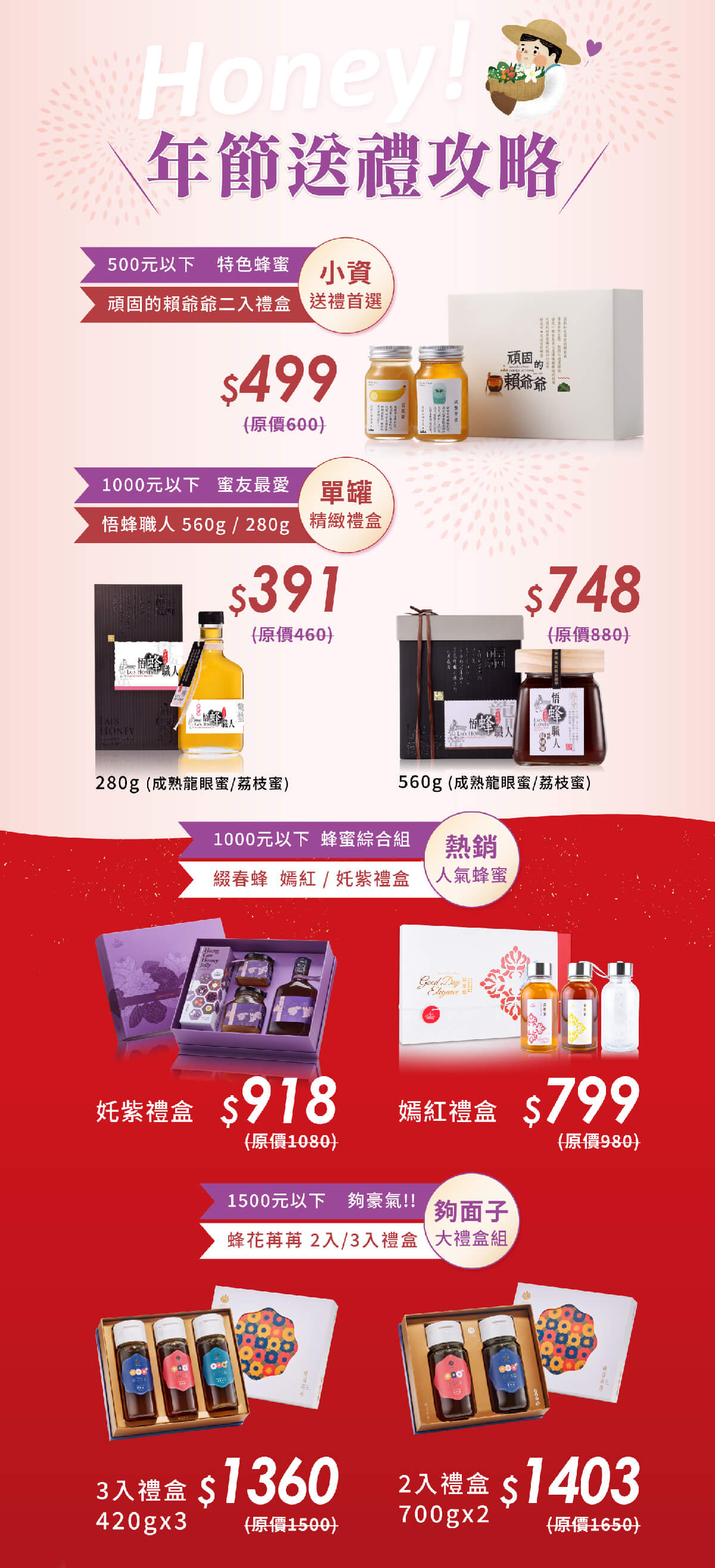 推薦理由: 這是年節的「視覺擔當」!紅紫色的包裝應景又喜氣,打開有豐富的蜂蜜組合,有蜂蜜也有蜂蜜醋。送給客戶這盒,祝福對方 2026 年業績長紅、大紅大紫!