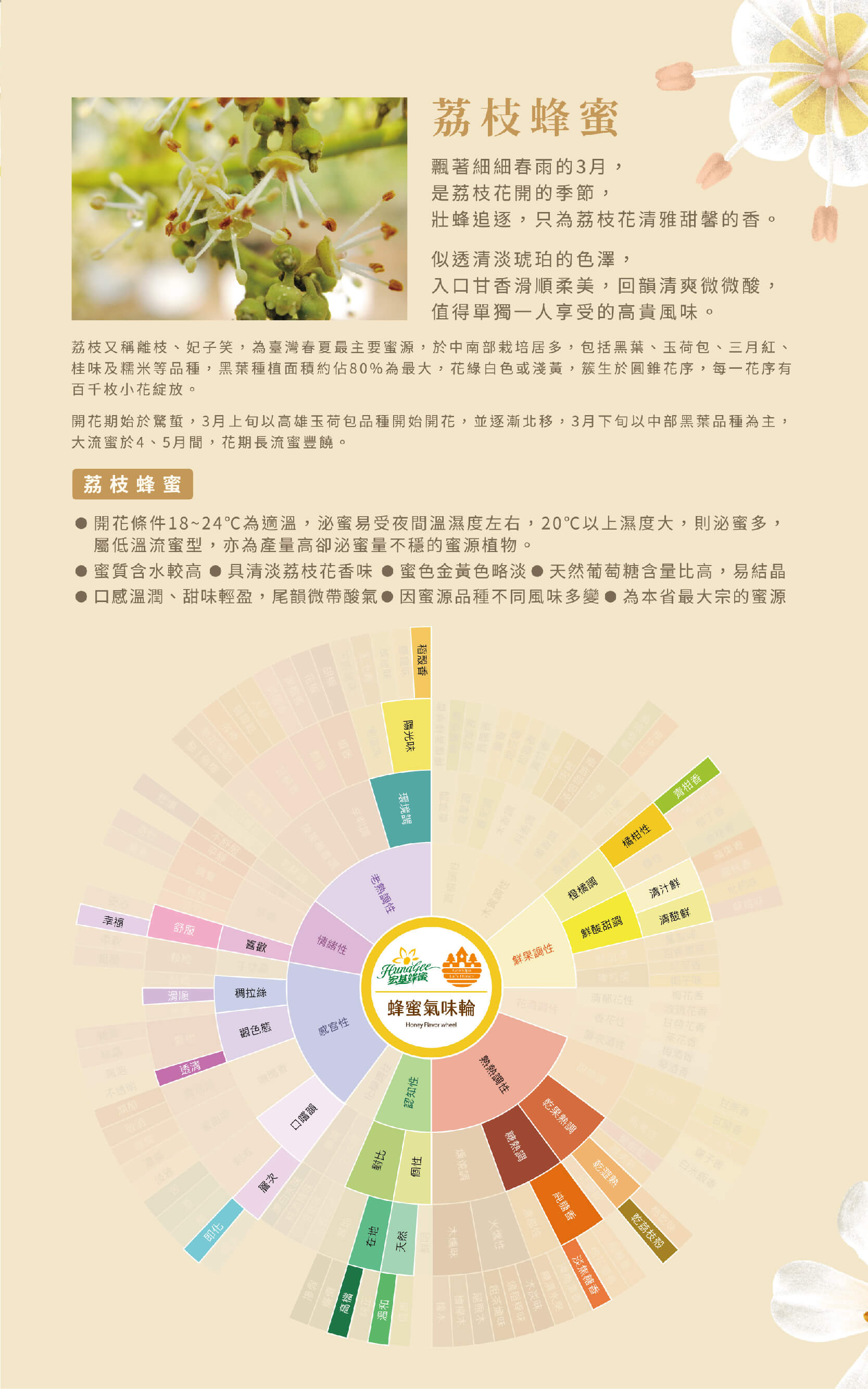 通常台灣荔枝花開於2月底-4月之間,此時蜂農們會開始追蜜,開啟逐蜜而居的生活。荔枝蜜味道帶點果香,甜度較龍眼蜜低,易結晶,是一款搭配紅茶很棒的蜂蜜。