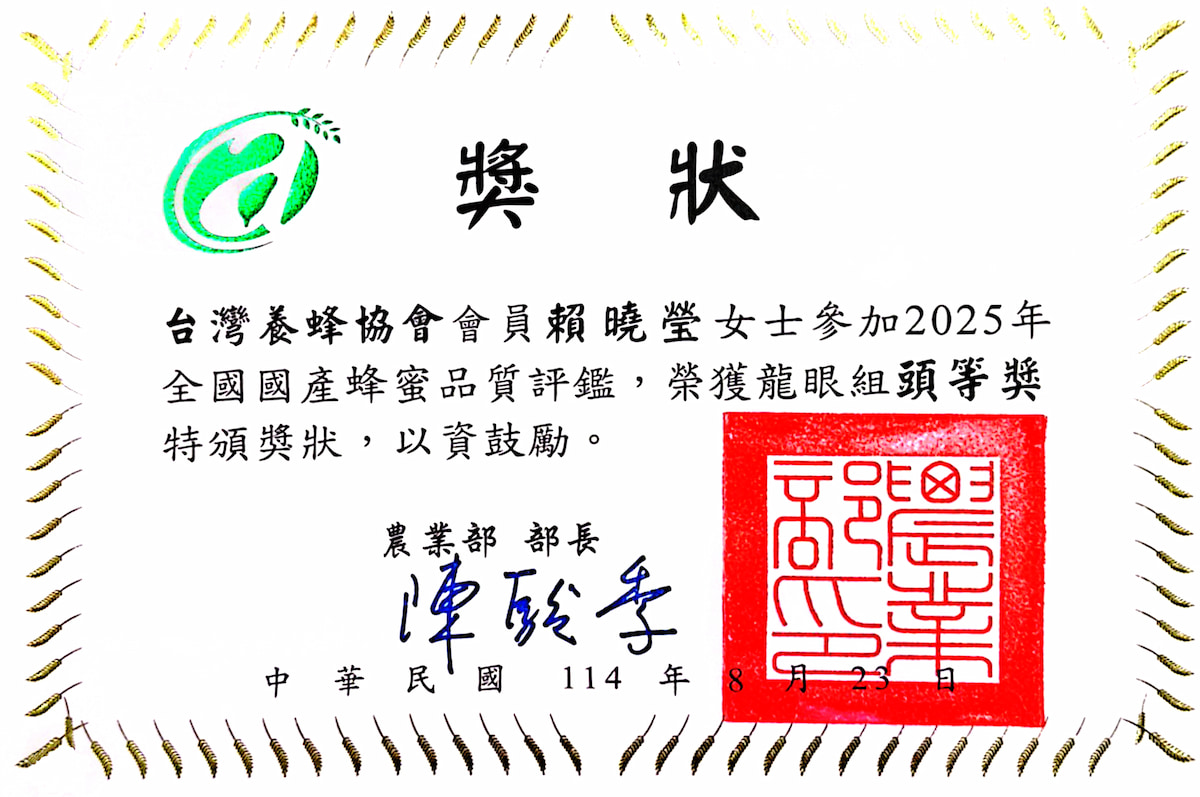 2025年(114年) 最新頭等獎 - 龍眼蜂蜜 限量上市! ★ 台灣國產蜂蜜。 ★ 100%純蜂蜜、無添加。台灣單一產區『極緻』單品蜜。 ★ 每瓶皆具「國產蜂產品證明標章」 ★ 2025年全國比賽頭等獎,純正濃郁風味極緻。 ★ 數量有限,售完為止。