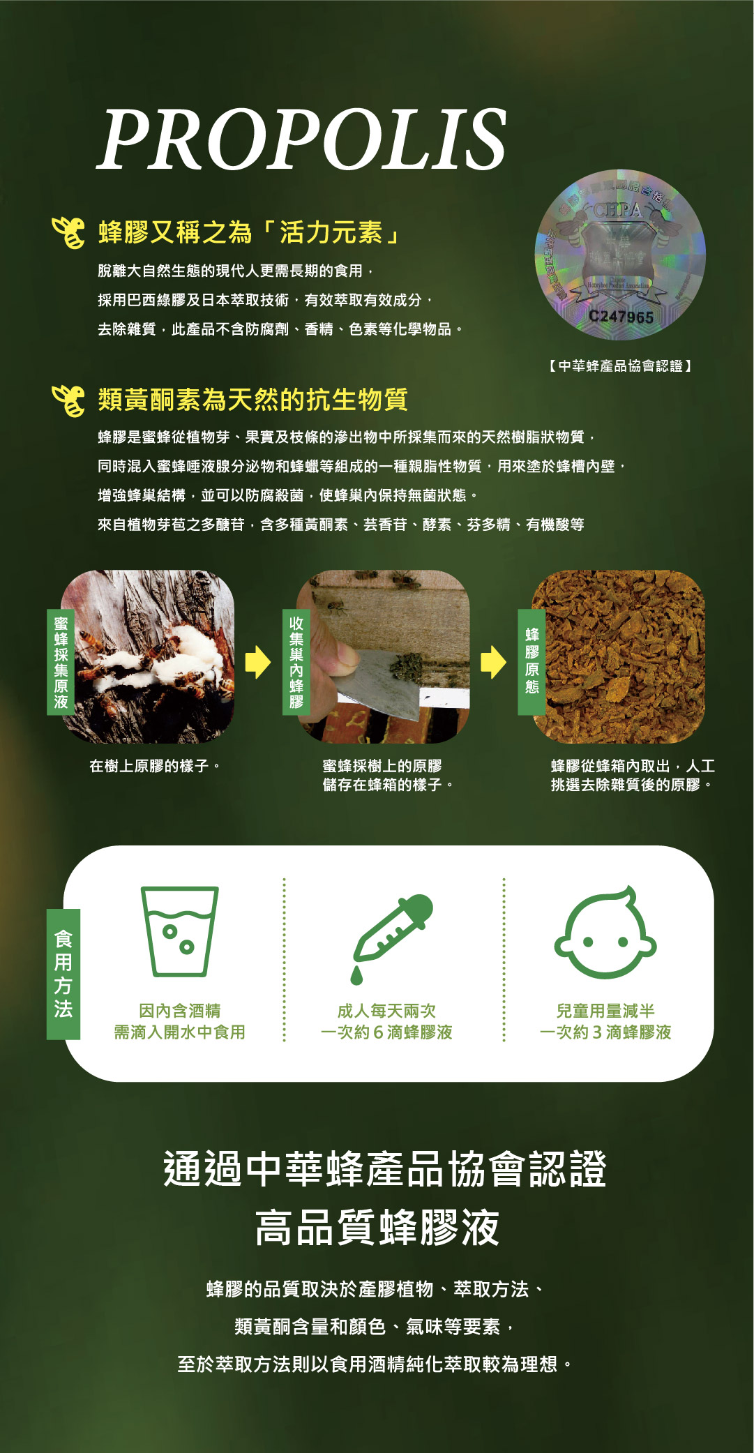 我們的蜂膠採用優質巴西綠膠,引用先進的日本萃取技術,去除多餘雜質並萃取出高純度的天然黃酮類成分。