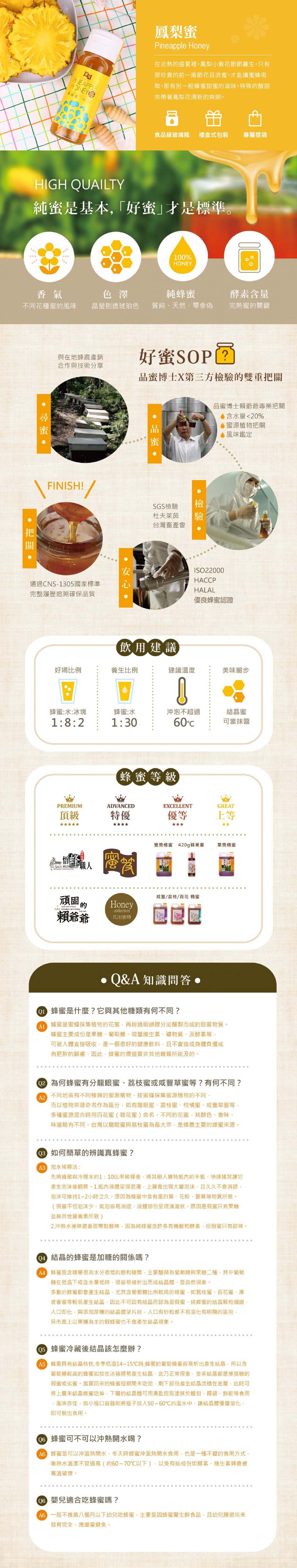●品名:蜜笈 鳳梨蜜《易結晶》●容量:420g/瓶●成分:蜂蜜(台灣)●原產地:台灣●保存期限:二年